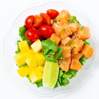 This bowl includes salmon, mango, green onions, cilantro, spring roll sauce, ponzu, green leaf lettuce, sushi rice, cucumbers and carrots. Topped with masago and sesame seeds.